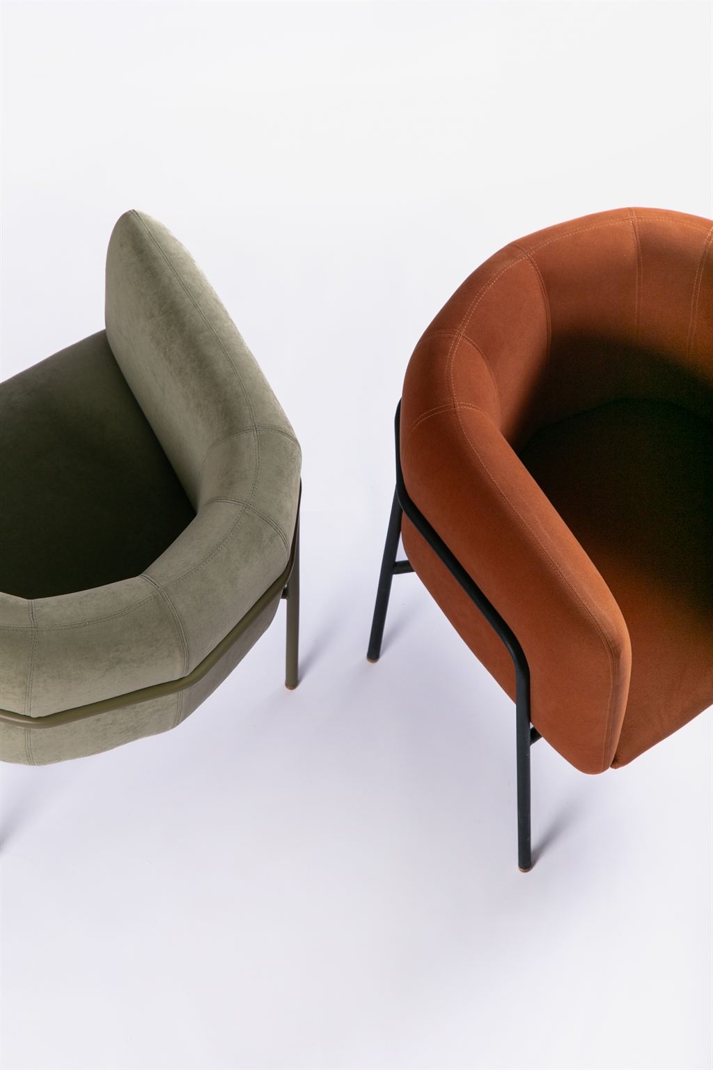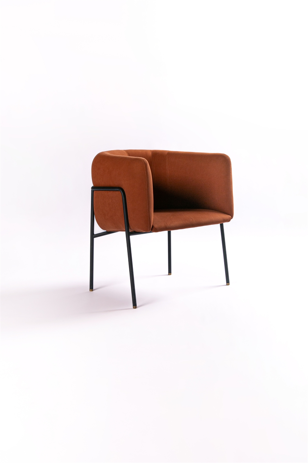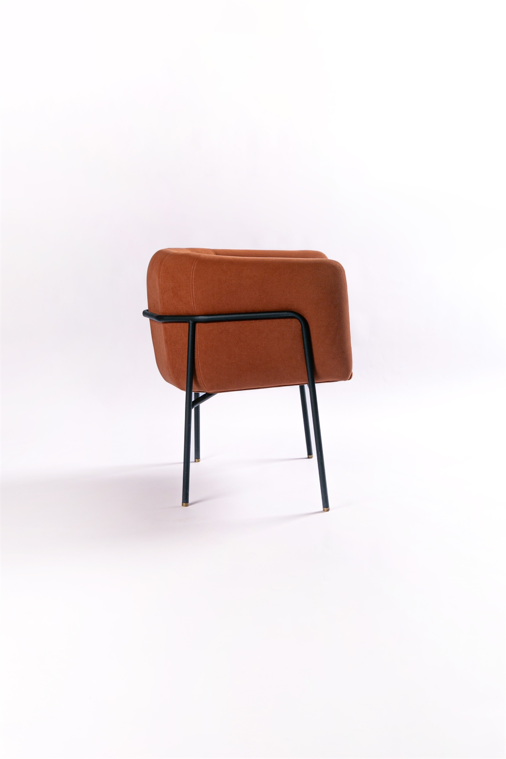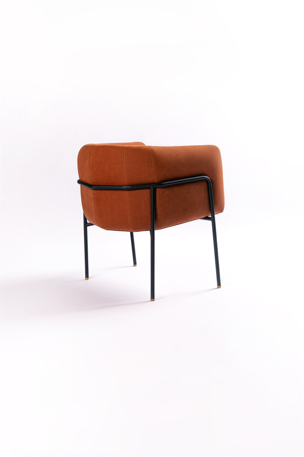 From a technical standpoint, the metal frame is built from round steel tubing, powder-coated and joined with precision. A continuous curved detail reinforces the enveloping gesture. The upholstered volume, with a wooden core, locks firmly into the frame, creating a dialogue between the visual weight of the body and the lightness of its support.