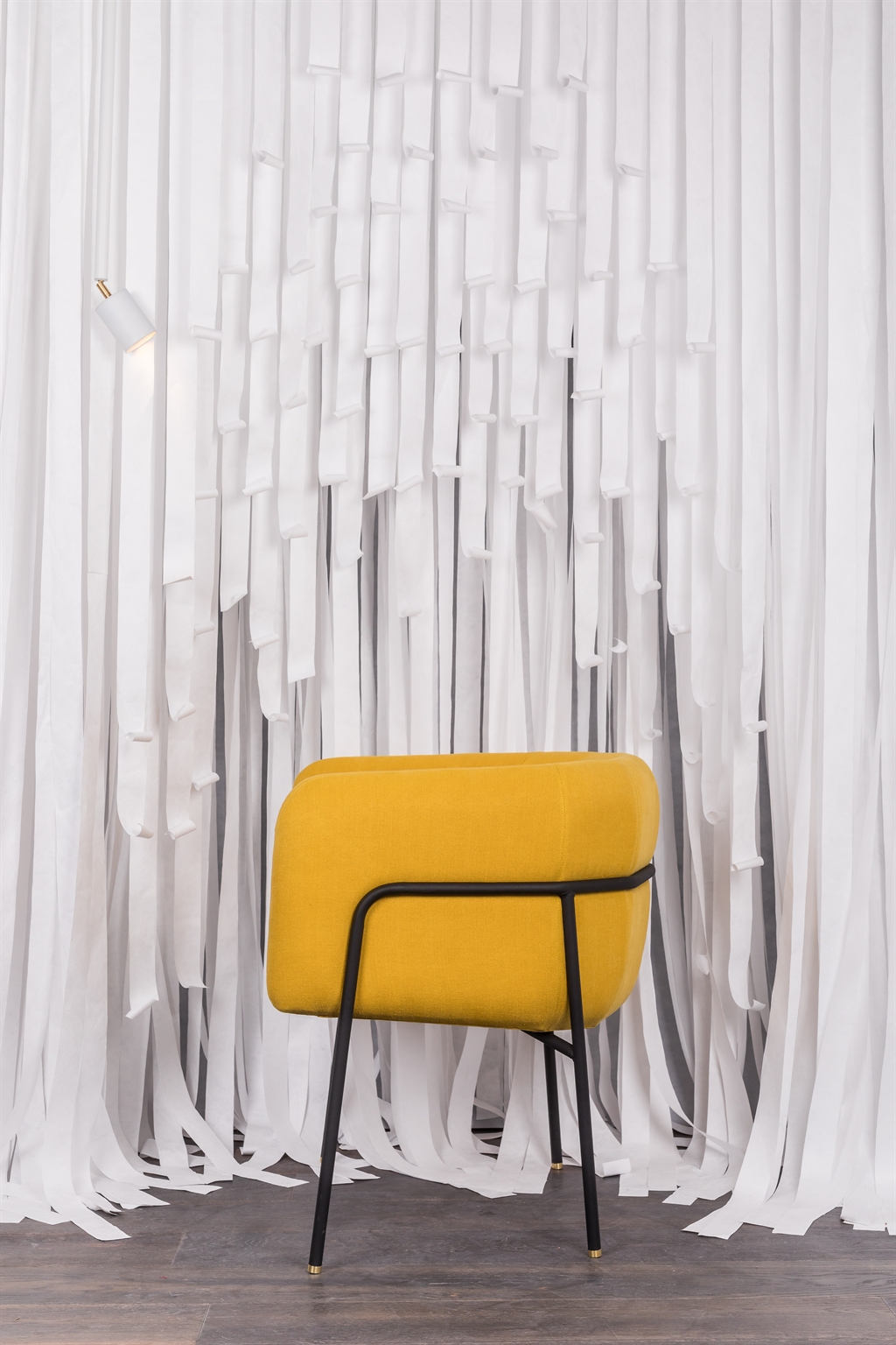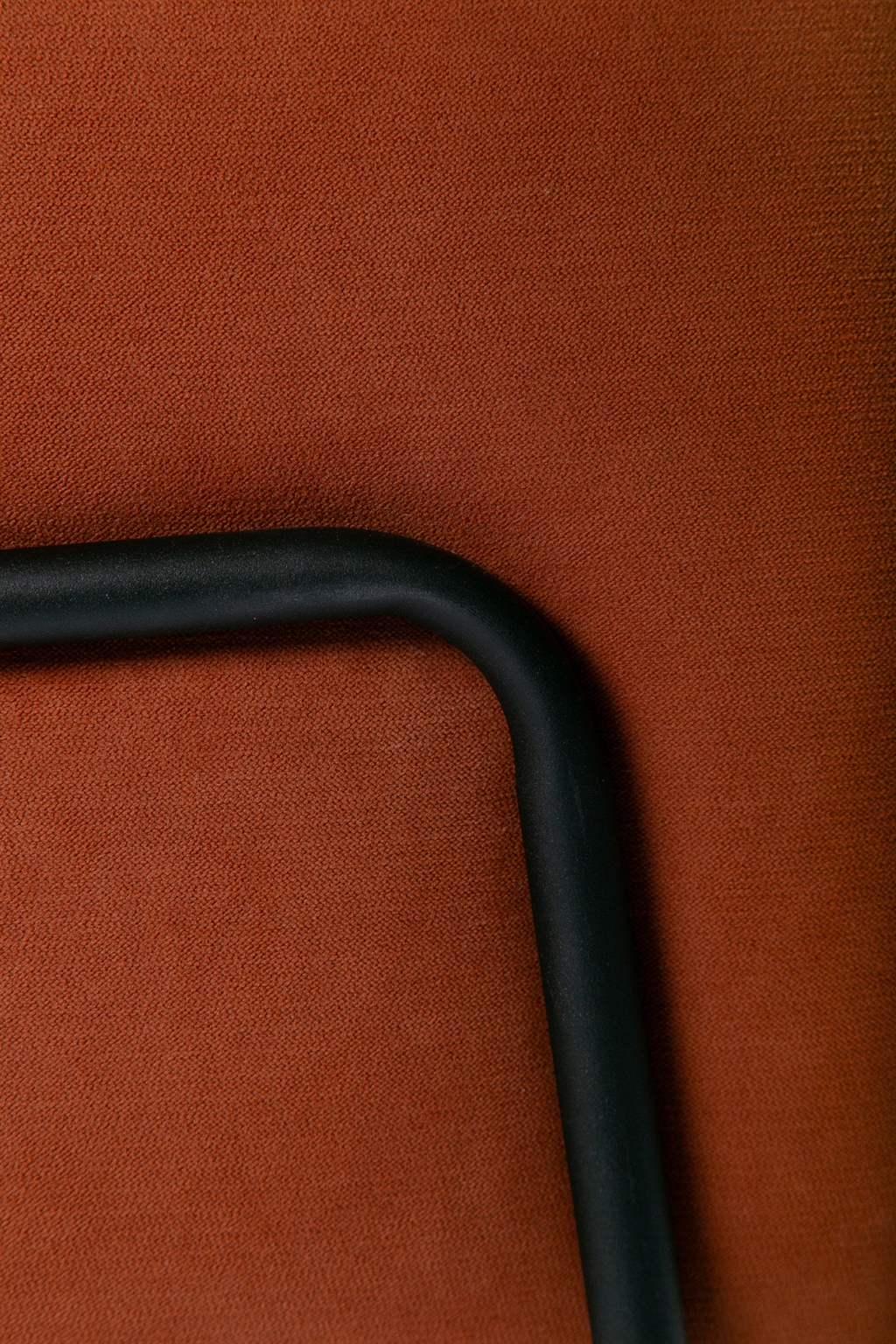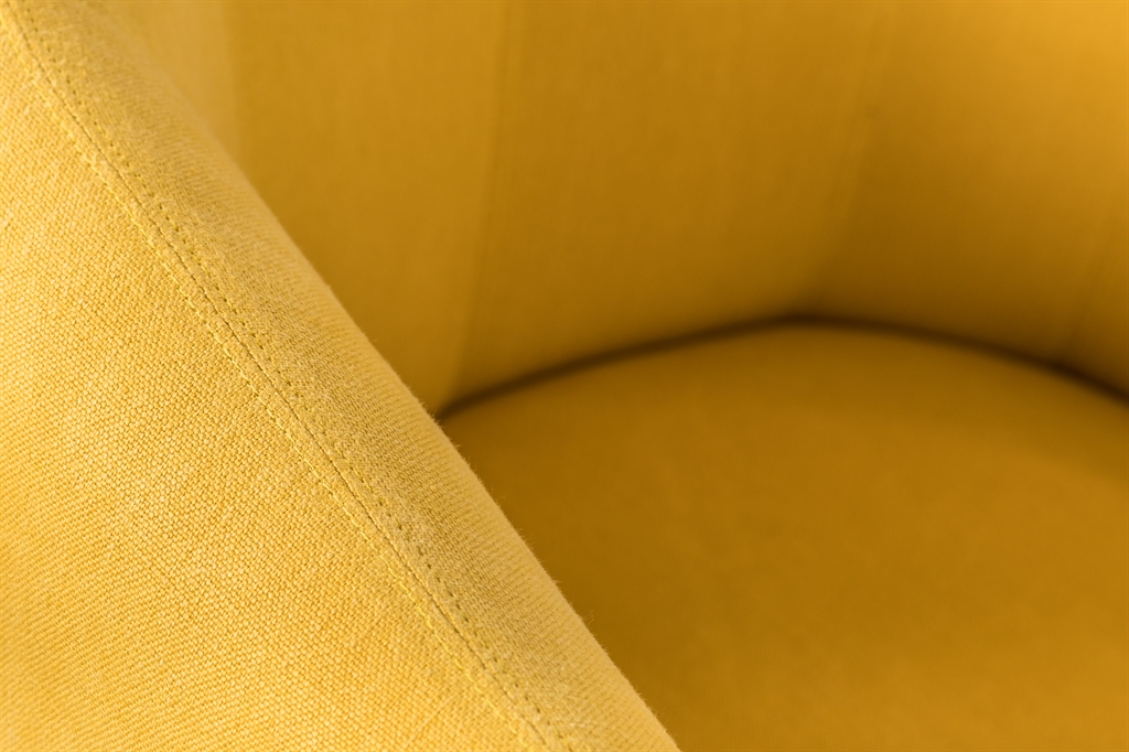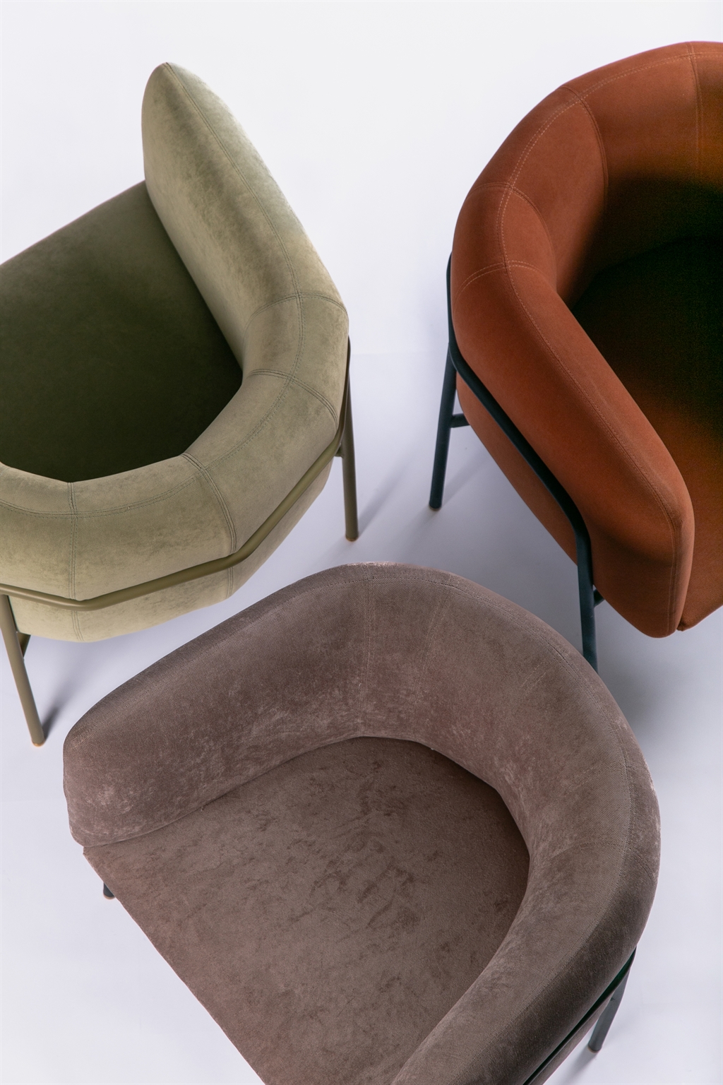 From a technical standpoint, the metal frame is built from round steel tubing, powder-coated and joined with precision. A continuous curved detail reinforces the enveloping gesture. The upholstered volume, with a wooden core, locks firmly into the frame, creating a dialogue between the visual weight of the body and the lightness of its support.
