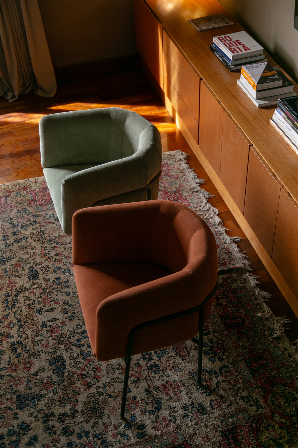 Designed for Giunta Muebles, this armchair begins with a clear gesture: the upholstered body is nested within the structure. A sort of corpulent, faceted capsule that floats, held by a continuous metal tube line that defines the perimeter, provides support, and outlines the outer contour with a subtle yet firm graphic presence.