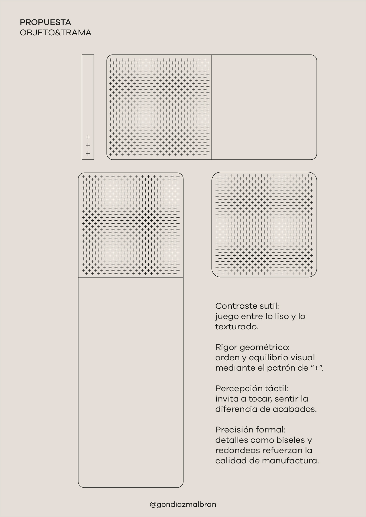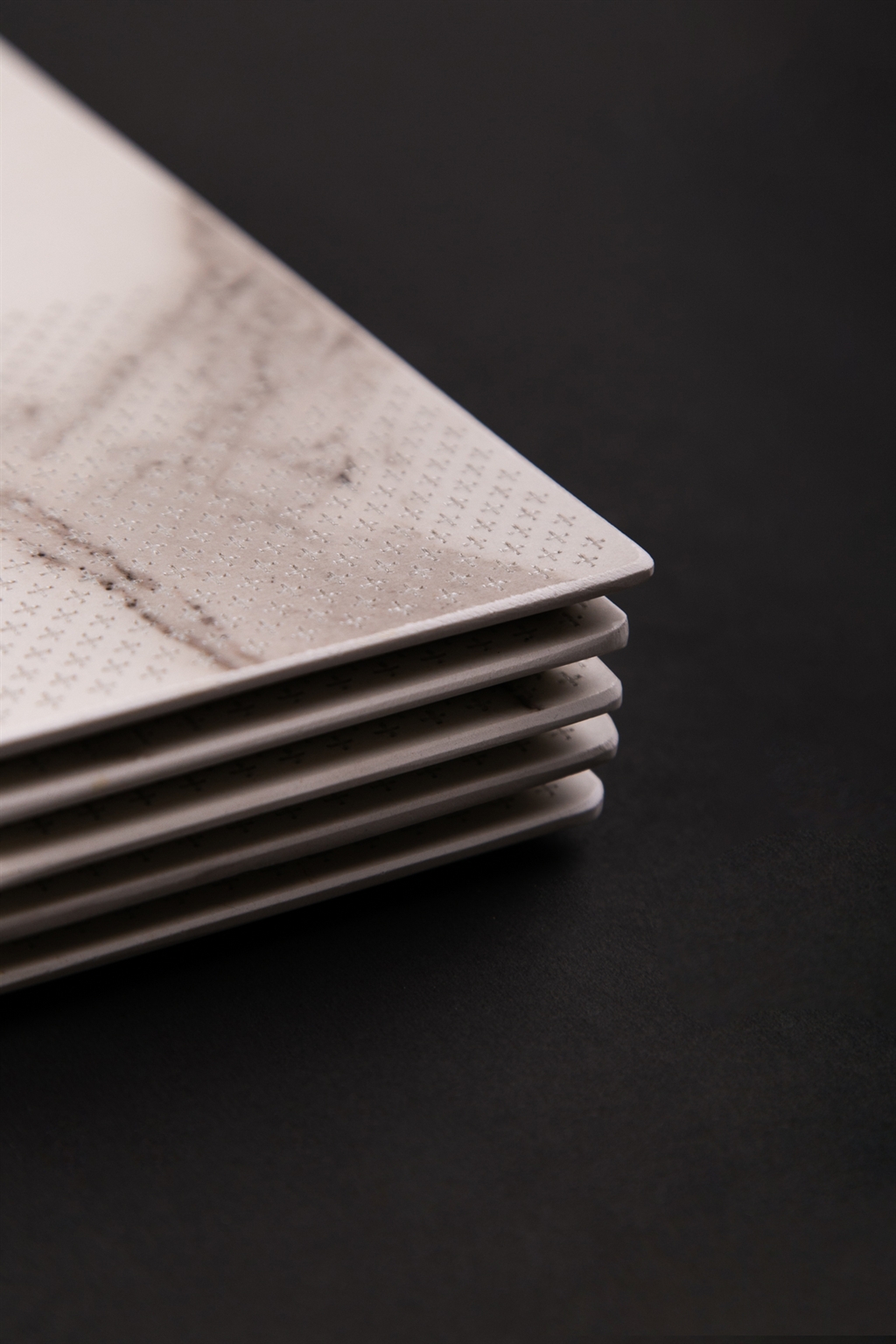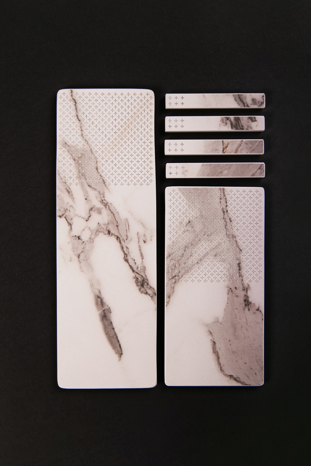 Each object is a meeting point between the artisanal and the technical, between the sensory and the rational, between raw material and the gesture that gives it meaning. A subtle surface texture was developed through the systematic repetition of the “+” symbol, creating a tactile and visual pattern that defines the collection without overshadowing the material itself.