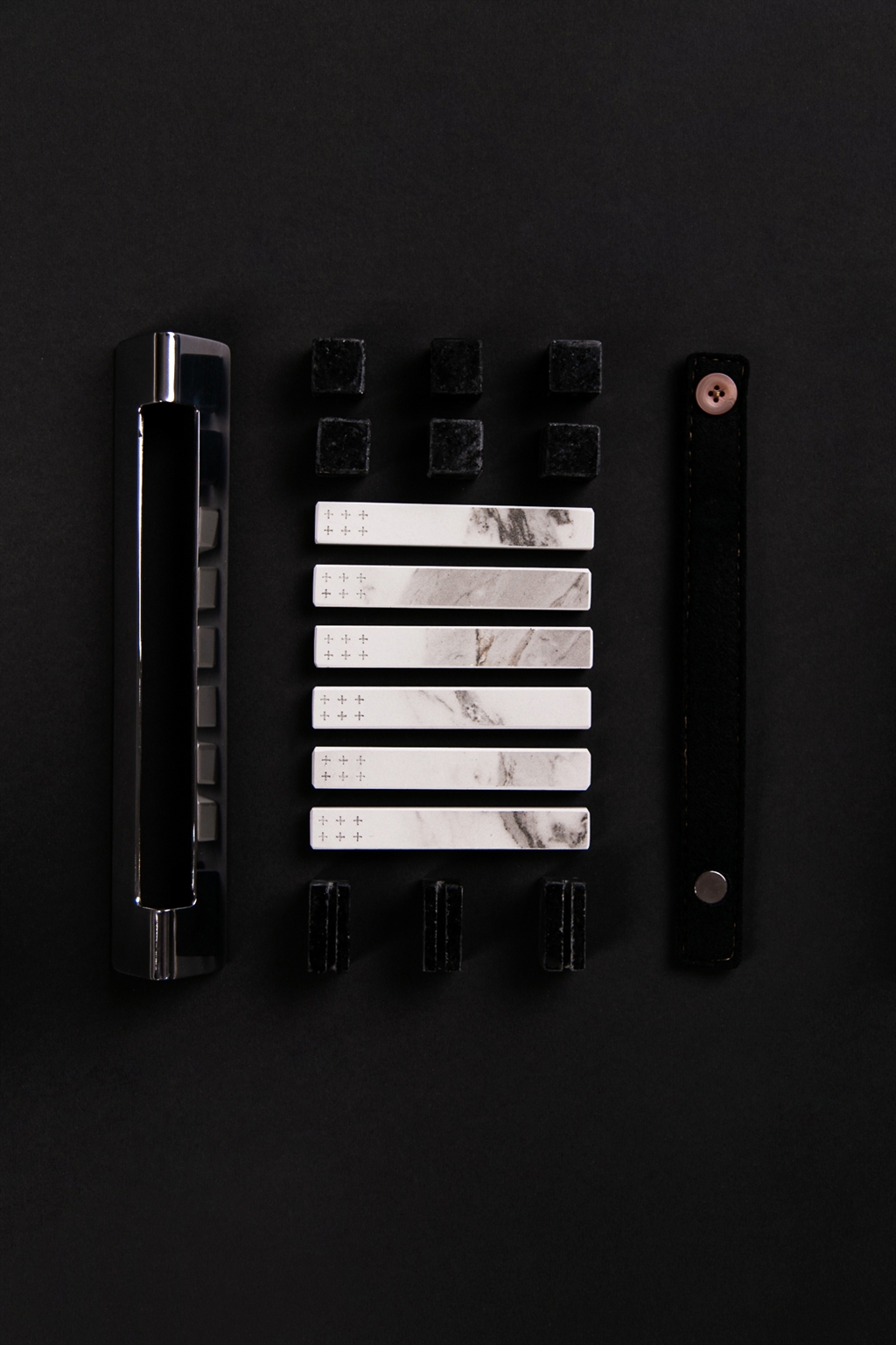 This pattern plays with contrast: matte and polished surfaces, solids and voids — reinforcing the sculptural dimension of each piece. The forms are geometric, yet soft. Carefully beveled edges and rounded corners add to the sense of precision and crafted detail.