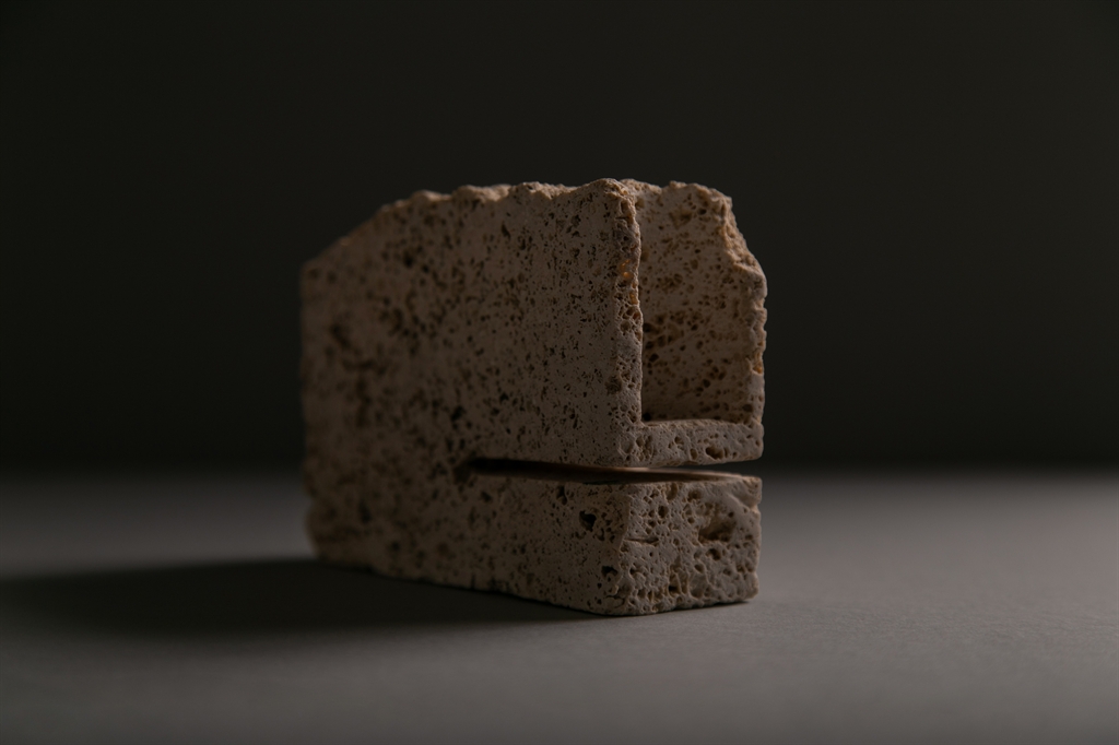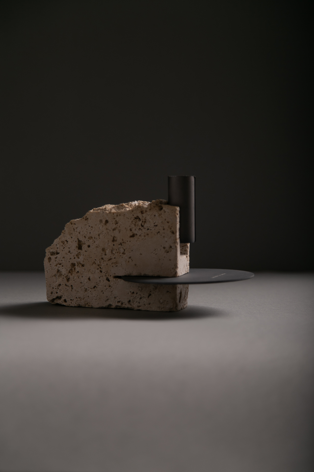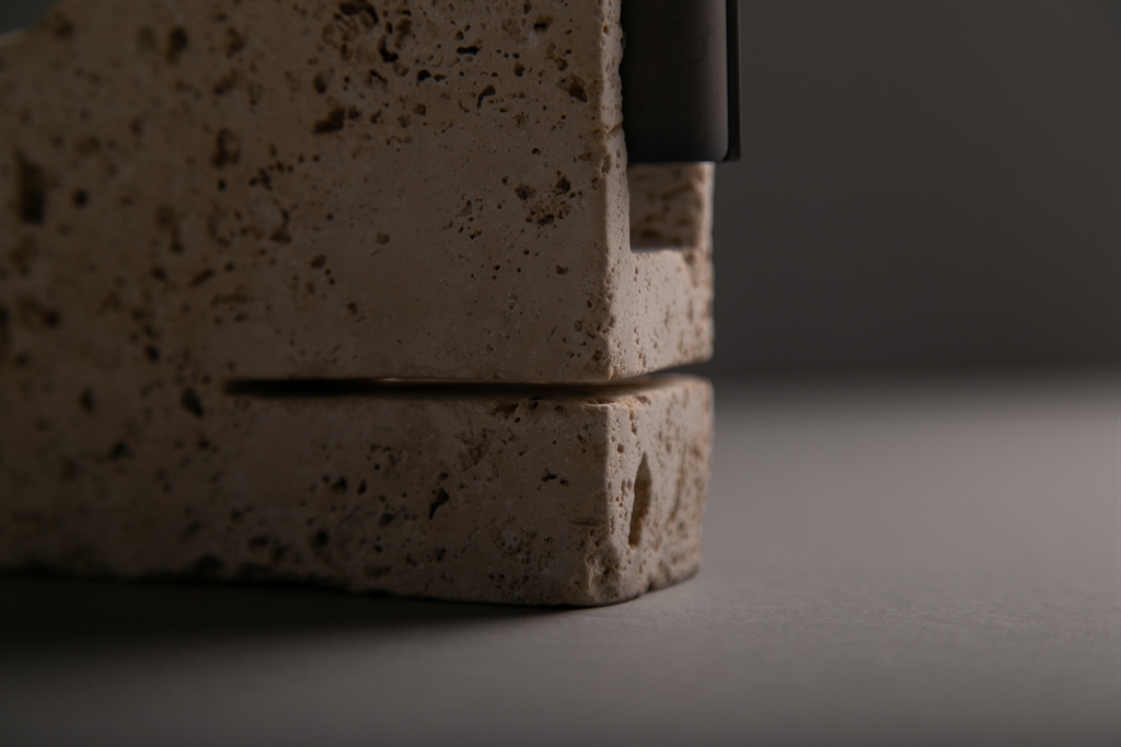 Natural travertine stone: porous, warm, organic. Each block is unique, with its own texture and presence.Anodized aluminum: technical, precise, satin finish. A material that reflects the care behind its crafting.