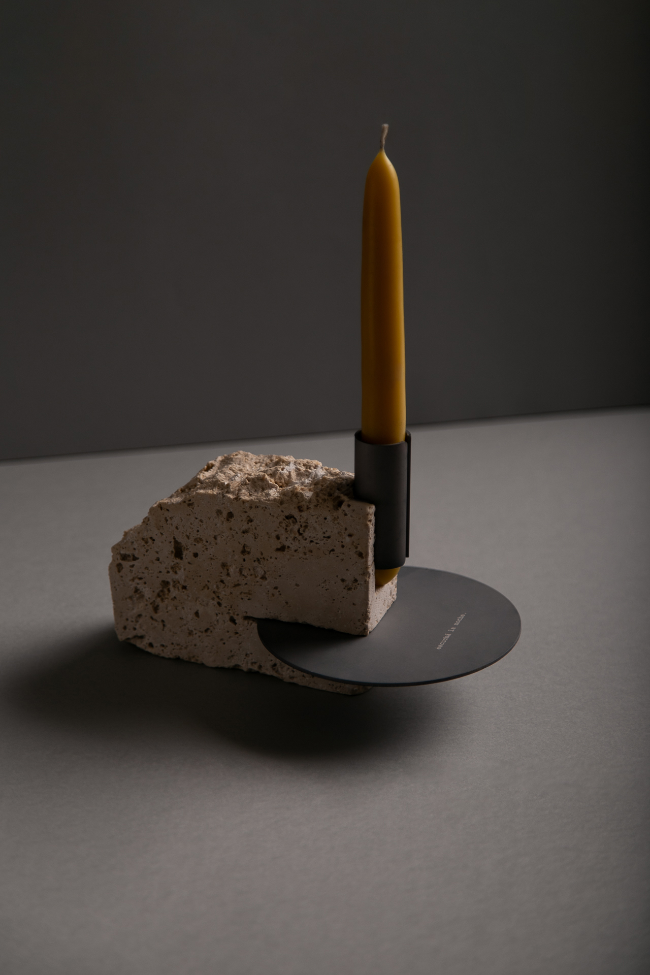 On the metal base of the candleholder, a minimal phrase: