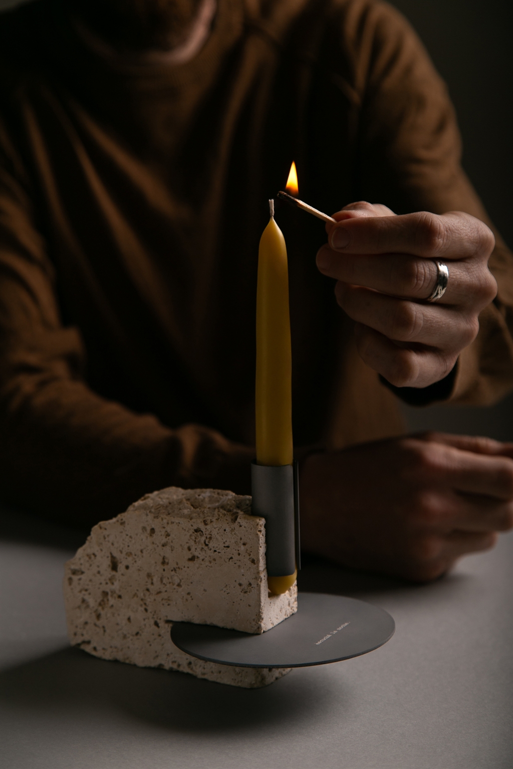 Originally conceived as a gift for people with whom we share meaningful projects, this object offers a pause. From the outset, the intention was to create a piece that connects with intimate and significant moments of everyday life: a dinner with friends, a quiet night with a partner, or simply, a solitary pause. The candle —an icon of warmth and contemplation— became the central axis of the design.