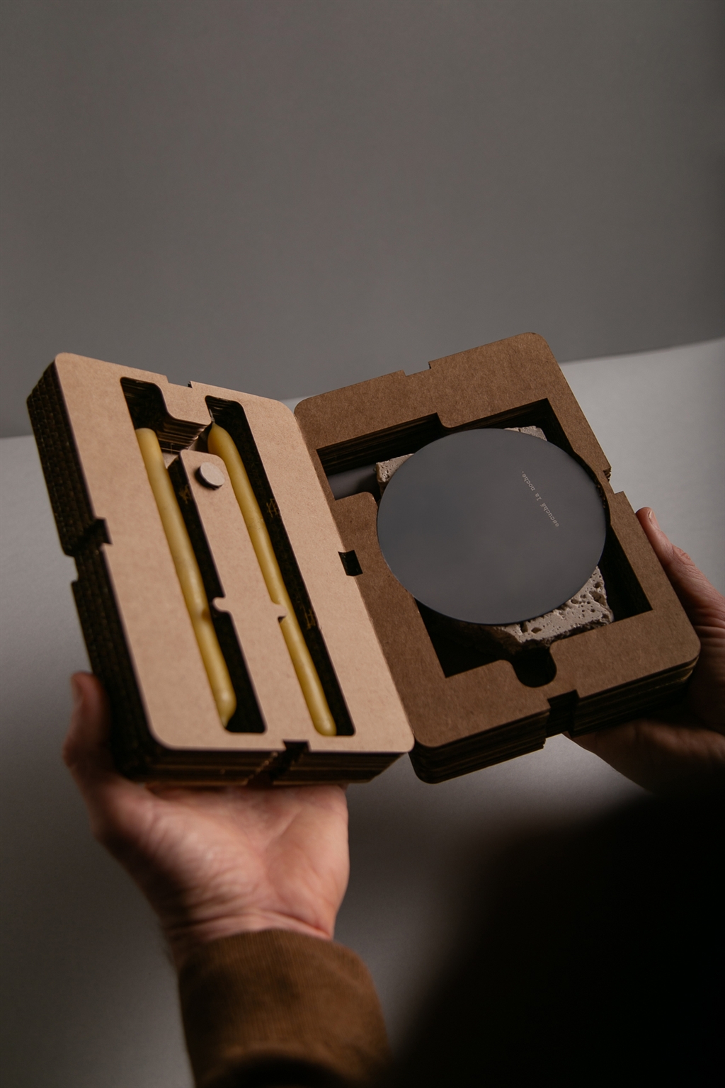 The packaging was designed to extend the project’s spirit: sober, sensitive, and functional. Made entirely from cardboard, its interlocking system protects each piece and reinforces the object’s value from the very first touch. It includes two natural beeswax candles —rare and carefully chosen for their color, texture, and scent— and each candleholder is delivered ready to be assembled by its recipient.